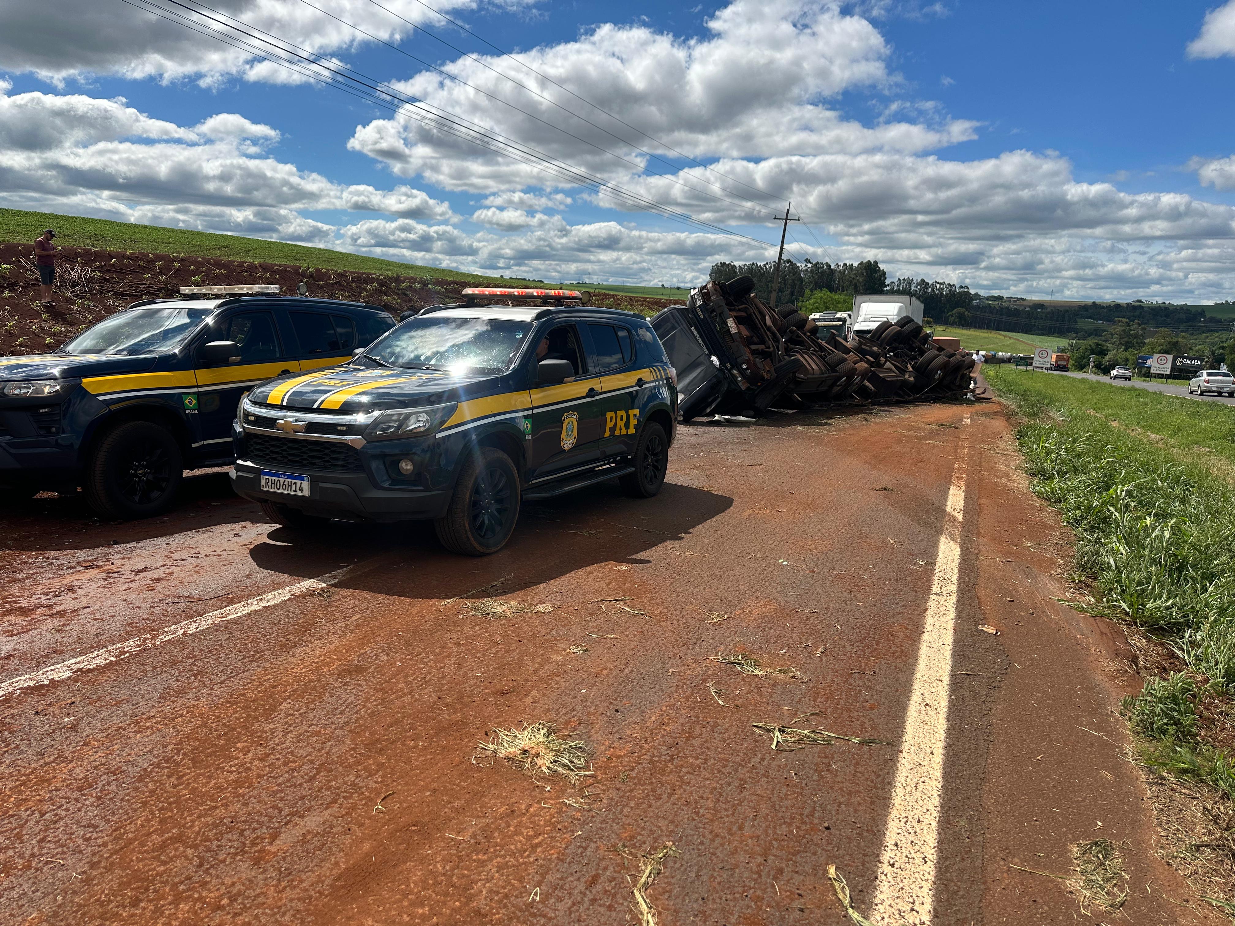 Tombamento de carreta paraguaia interdita BR-163 entre Toledo e Cascavel; uma faixa já foi liberada