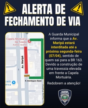 Um trecho da Avenida Maripá, está interditado no sentido de quem segue em direção à rodovia BR-163. A interdição começou nesta semana e deve seguir até a próxima segunda-feira, dia 07 de abril, conforme comunicado da Guarda Municipal (GM).