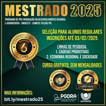 O período de inscrições para seleção de alunos regulares para ingresso no primeiro semestre de 2025 no Mestrado do Programa de Pós-Graduação em Desenvolvimento Regional e Agronegócio (PGDRA) da Universidade Estadual do Oeste do Paraná (Unioeste) campus de Toledo continua aberto. As inscrições serão aceitas até o dia 3 de fevereiro de 2025, com oferta de 10 vagas de ampla concorrência e 1 (uma) vaga para Pessoa com Deficiência (PCD).