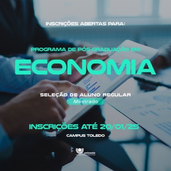 Está aberto o período de inscrições para seleção de alunos regulares para Mestrado no Programa de Pós-Graduação em Economia (PGE), turma de 2025, da Universidade Estadual do Oeste do Paraná (Unioeste) Campus de Toledo. O prazo segue até dia 20 de janeiro de 2025, e visa preencher 12 vagas.