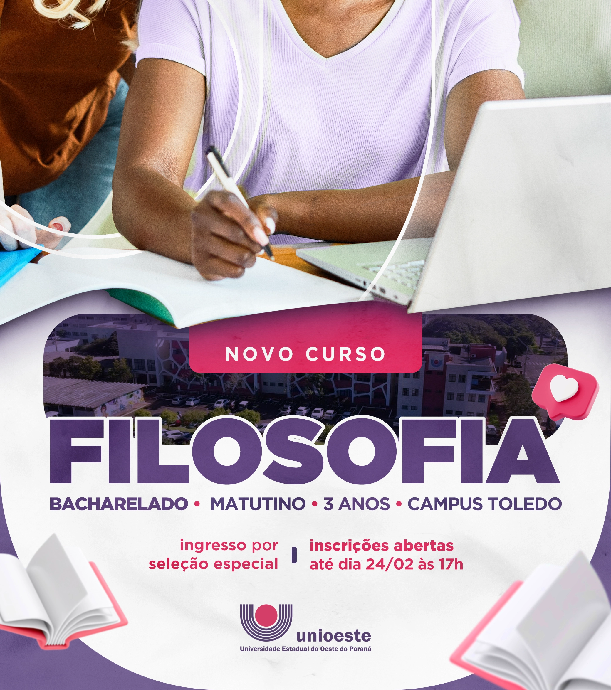A Universidade Estadual do Oeste do Paraná (Unioeste), campus Toledo, está com inscrições abertas para o vestibular especial do novo curso de Filosofia (Bacharelado). O curso será oferecido no período matutino, com duração de três anos.