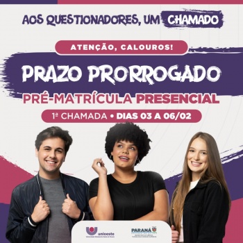A Universidade Estadual do Oeste do Paraná (Unioeste) convoca todos os aprovados no limite de vagas do Vestibular e Enem Unioeste 2025, para comparecerem na Coordenação Acadêmica do campus de funcionamento do curso escolhido, para a realização da pré-matrícula presencialmente até o dia 06 de fevereiro, das 8h30 às 11h30min, das 14h às 17h ou das 19h às 21h.