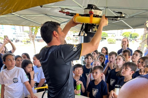 Além da apresentação dos veículos aéreos não tripulados, a UTFPR proporcionou uma experiência imersiva única aos estudantes. Utilizando óculos de realidade virtual, cada participante pôde "mergulhar" em um ambiente marinho por 20 a 30 segundos, observando tartarugas nadando ao seu redor. A atividade, que encantou os jovens visitantes, foi cuidadosamente acompanhada por discentes e servidores da UTFPR, que orientaram o uso do equipamento e reforçaram a mensagem sobre a beleza e a necessidade de proteger nossos ecossistemas aquáticos.