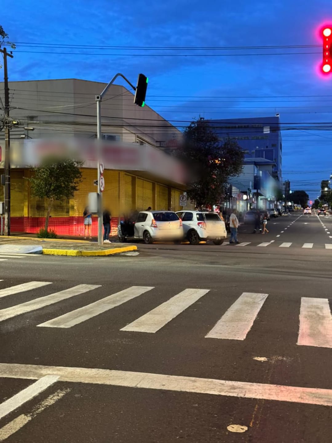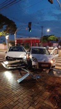 Veículos invadem calçada e derrubam placa após colisão no Centro de Toledo