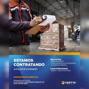 A Vertys Energy Group de Toledo está selecionando candidato para a função de Auxiliar de Expedição, atuando diretamente na organização e movimentação de materiais dentro do setor logístico da empresa.