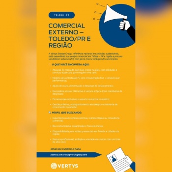 Vertys Energy Group de Toledo contrata Consultor de Vendas; confira os detalhes e candidate-se aqui