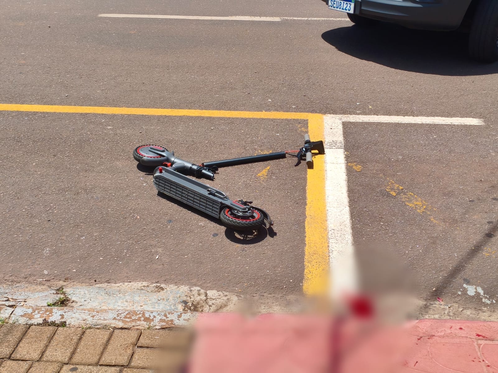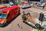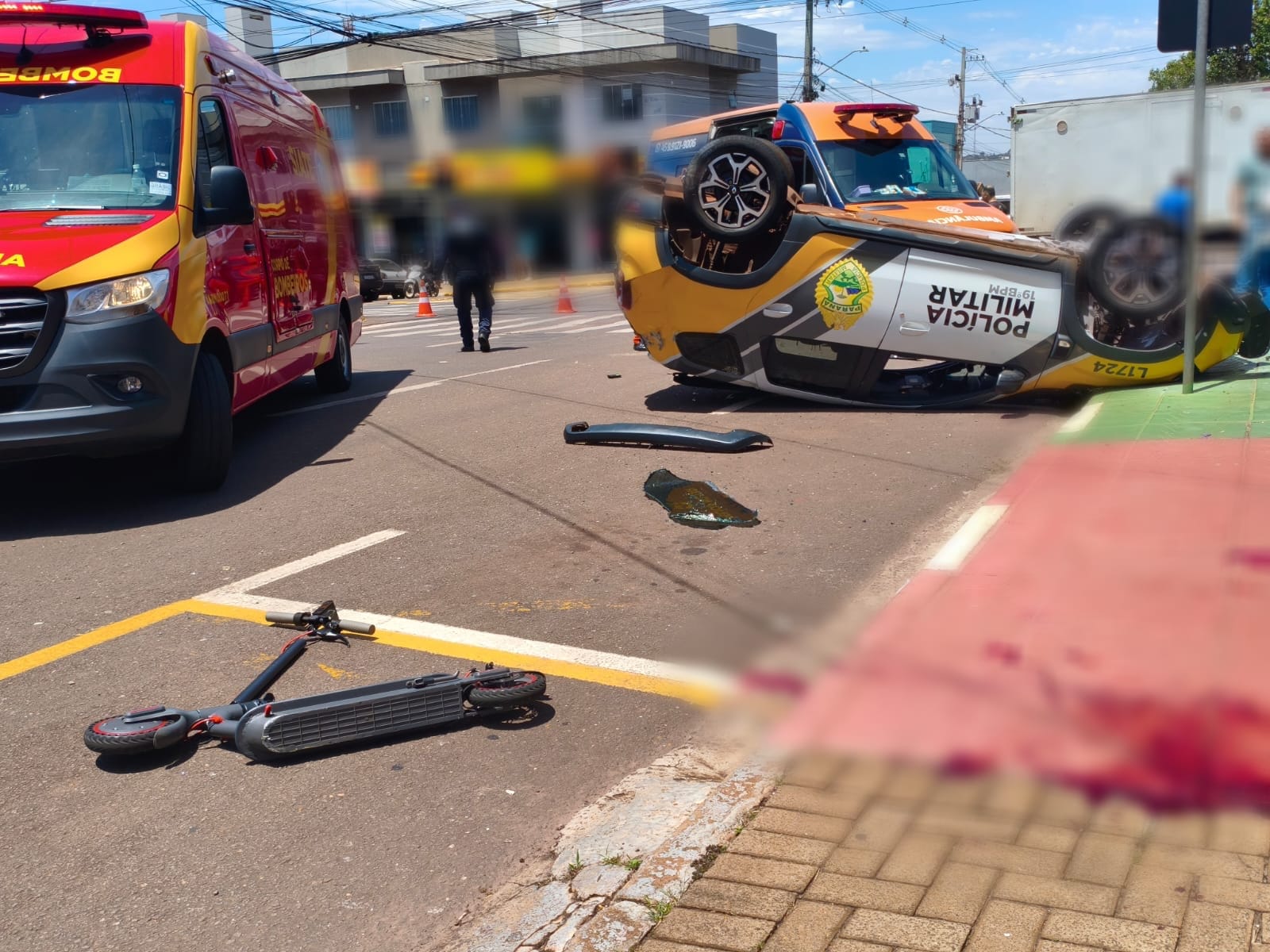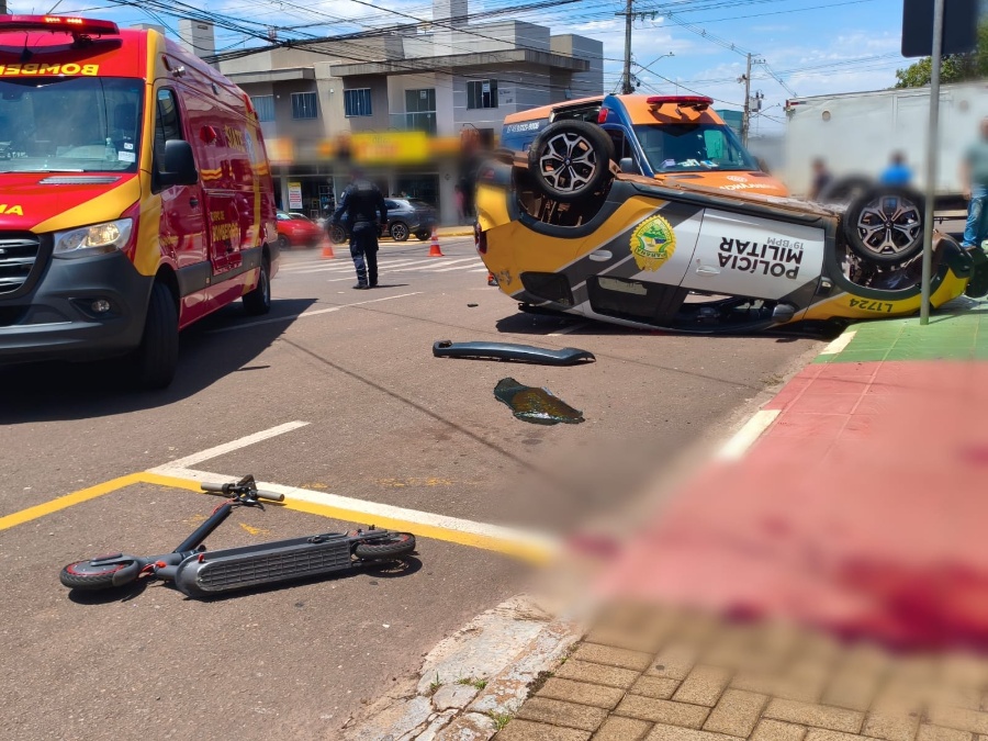 Viatura da PM capota após colisão no Centro de Toledo e atinge jovem em patinete; vítima está em estado grave