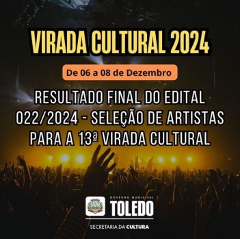 A Secretaria da Cultura de Toledo divulgou o resultado final do Edital de Nº 022/2024, que selecionou artistas para compor a programação da 13ª Virada Cultural.