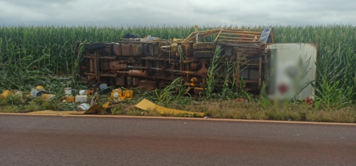 Policial Caminhão tomba após falha mecânica e deixa quatro feridos na PR-581, em Tupãssi 8 meses atrás