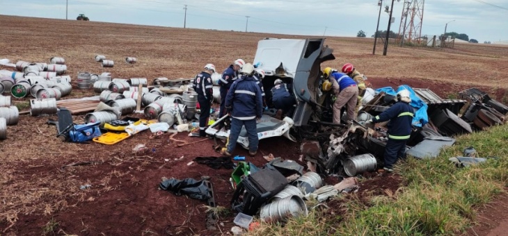 Policial Carreta com barris de chopp tomba entre Assis Chateaubriand e Toledo e duas pessoas ficam presas às ferragens 11 meses atrás