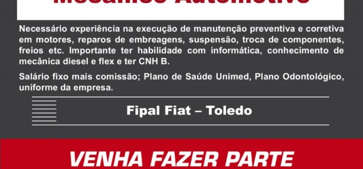 Cotidiano Fipal Fiat de Toledo está com vaga aberta para Mecânico Automotivo; confira os requisitos e candidate-se aqui 4 meses atrás