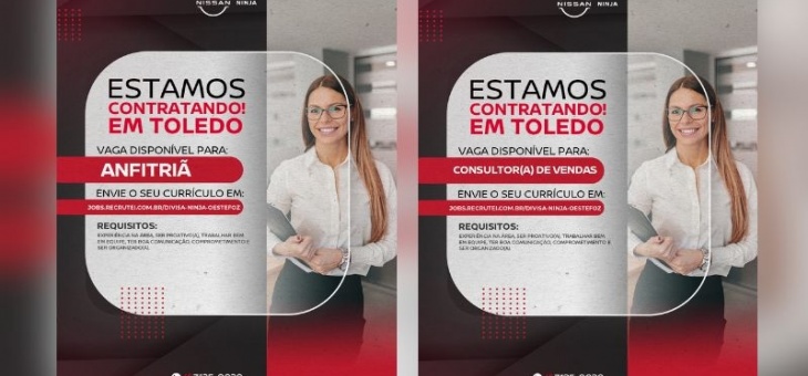 Cotidiano Nissan Ninja de Toledo abre vagas para Anfitriã e Consultor(a) de Vendas; confira os requisitos e envie o seu currículo aqui Há 2 dias