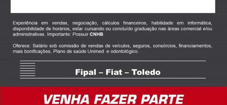 Cotidiano Fipal Fiat de Toledo contrata Vendedor de Veículos; confira os detalhes e envie o seu currículo aqui 8 meses atrás