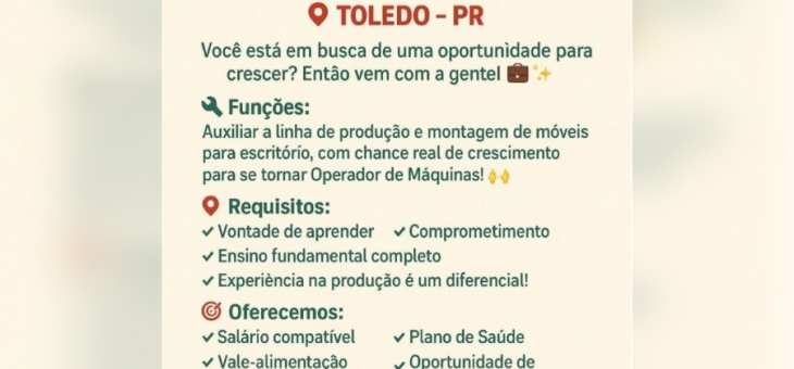 Cotidiano Modilac Indústria e Comércio de Móveis de Toledo contrata Auxiliar de Produção! Envie o seu currículo aqui 10 meses atrás