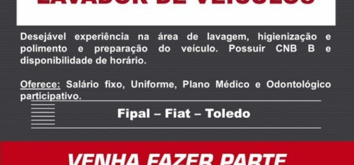 Cotidiano Fipal Fiat de Toledo abre vaga para Lavador de Veículos! Envie o seu currículo aqui! 10 meses atrás