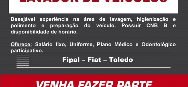 Cotidiano Fipal Fiat de Toledo abre vaga para Lavador de Veículos! Envie o seu currículo aqui! 12 meses atrás