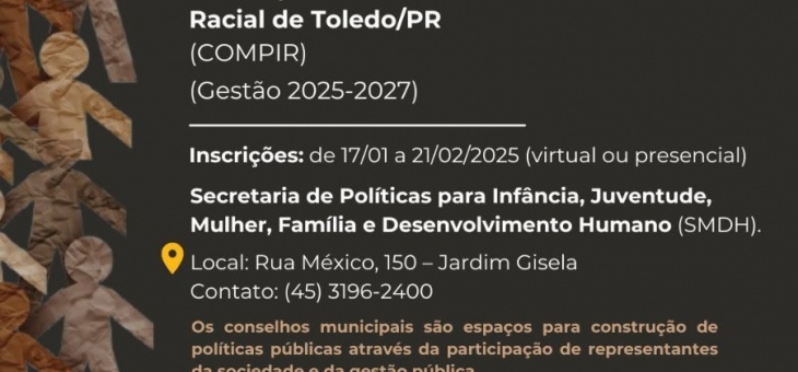 Cotidiano Toledo abre inscrições para escolha de representantes da sociedade civil no Conselho Municipal de Promoção da Igualdade Racial um ano atrás