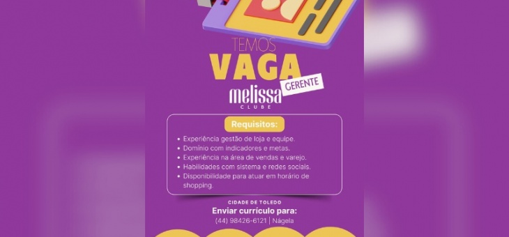 Cotidiano O Clube Melissa de Toledo está com vaga aberta para Gerente! Envie o seu currículo aqui um ano atrás