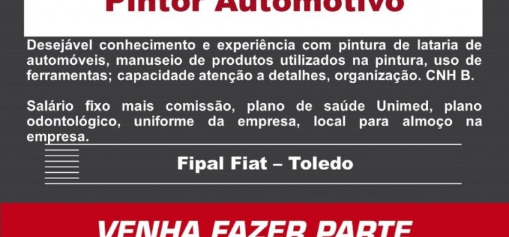 Cotidiano Fipal Fiat de Toledo abre vaga para Pintor Automotivo! Envie o seu currículo aqui um ano atrás