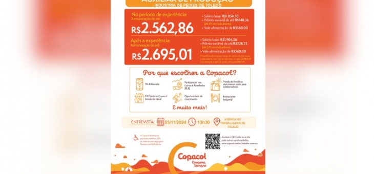 Cotidiano Copacol de Toledo abre vaga para Auxiliares de Produção na indústria de peixes; saiba como se candidatar aqui um ano atrás