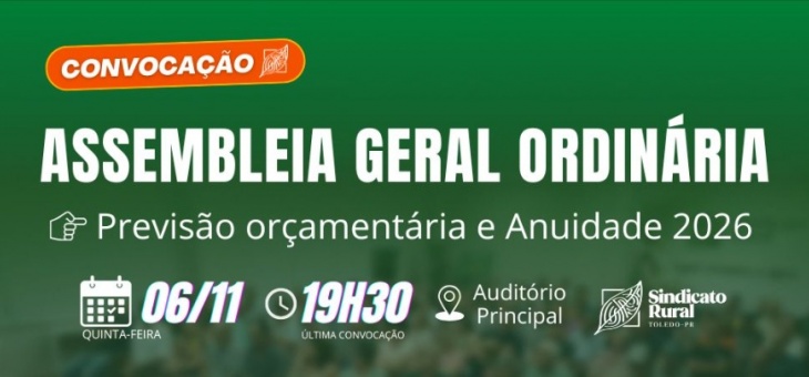 Cotidiano Sindicato Rural de Toledo convoca associados para Assembleia no dia 6 de novembro 2 meses atrás