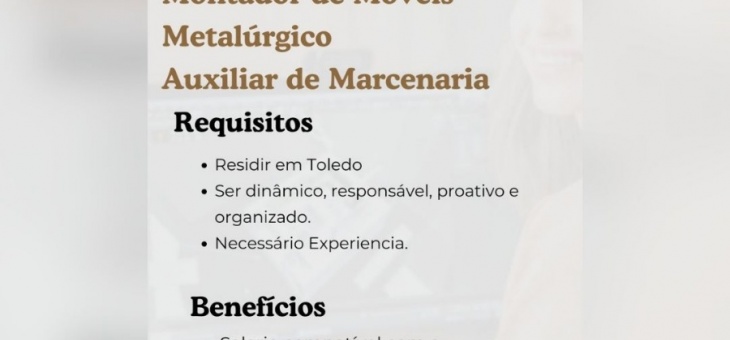 Cotidiano Angel Móveis de Toledo abre vagas para Marceneiro, Montador de móveis, Metalúrgico e Auxiliar de marcenaria; envie o seu currículo aqui Há 6 dias