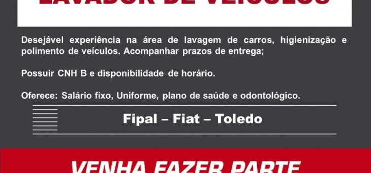 Cotidiano Fipal Fiat de Toledo abre vaga para Lavador de Veículos! Envie o seu currículo aqui! Há 4 dias