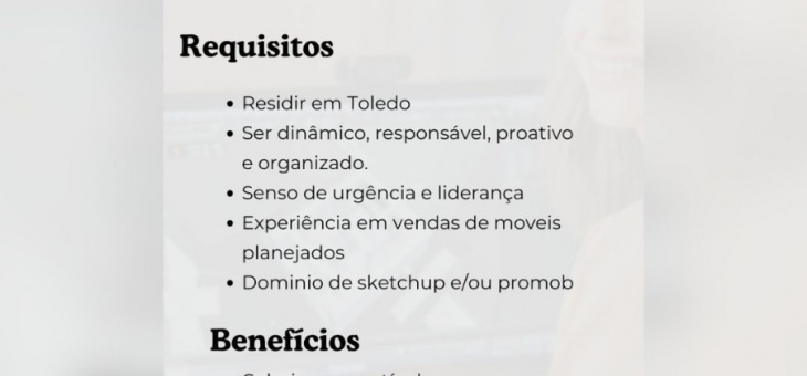 Cotidiano Angel Móveis Modern Design de Toledo abre oportunidade para Gerente Projetista; confira os requisitos e candidate-se aqui 2 semanas atrás