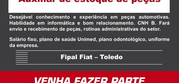 Cotidiano Fipal de Toledo abre vaga para Auxiliar de Estoque de Peças! Confira os requisitos e envie o seu currículo aqui 3 semanas atrás